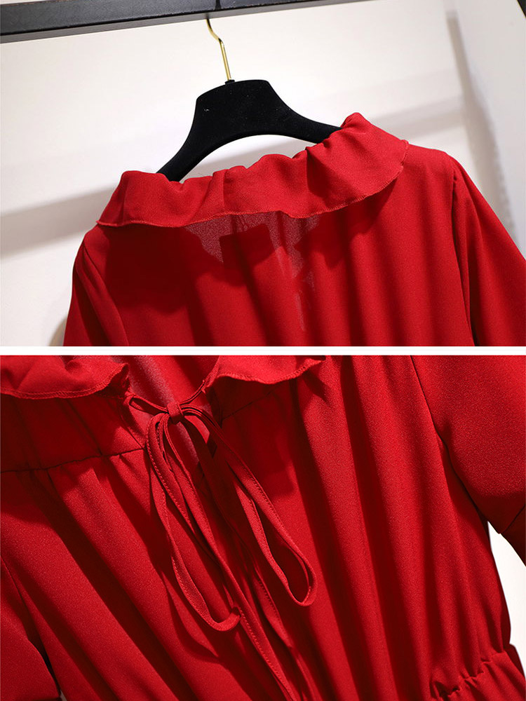 ミディ丈、上品、襟付き、エレガント、ウエスト絞り、フレア袖、裾フリル