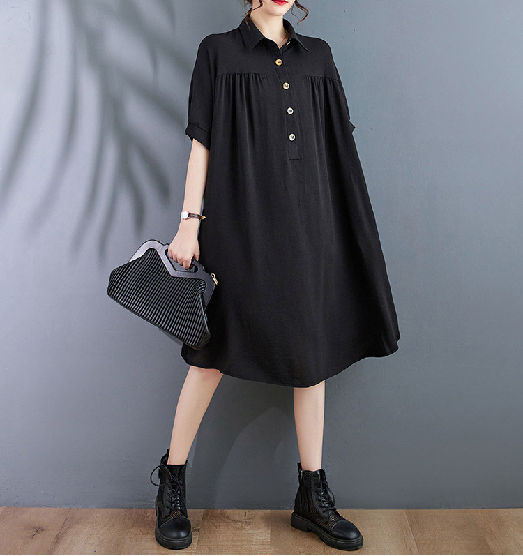 すっきりバスト、シンプル、襟付き、ミディ丈、シャツワンピース