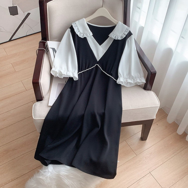 上品、モノトーン、ガーリー、襟付き、大きめ襟、ビッグカラー、パフスリーブ、レイヤード、重ね着風、Vネック