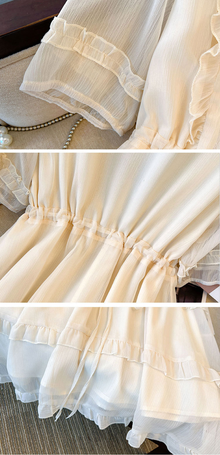 ガーリー、上品、フレア、フリル、シンプル、下半身カバー、ウエストシェイプ、ウエスト紐、Vネック