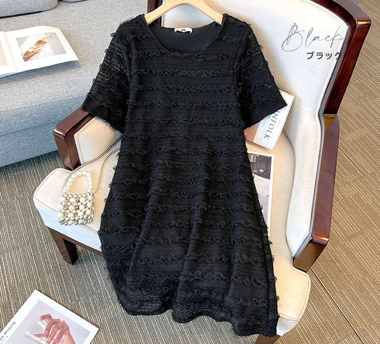 可愛さと上品さが同居した、立体ボーダーデザインのIラインレースワンピースをご紹介します。繊細なレースをベースにしたこのワンピースは、エレガントな雰囲気を演出してくれます。