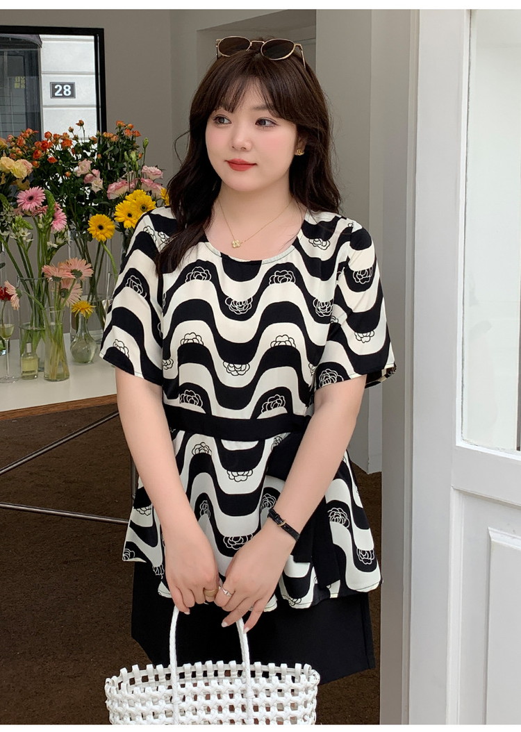 大きいサイズのウエストリボンでお腹カバー♪デザインボーダー&花柄トップス-全身