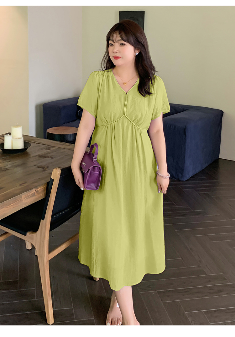 このワンピースは、Vネックカットのネックラインが綺麗で、顔周りをスッキリと見せてくれます。