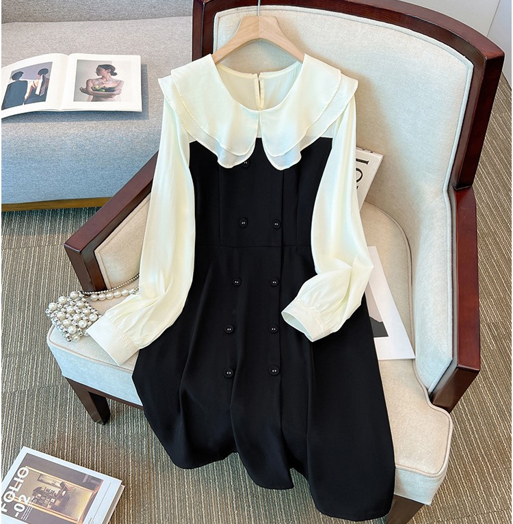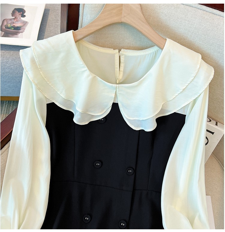 襟のフリルが可愛らしさを引き立てる、素敵なワンピース。