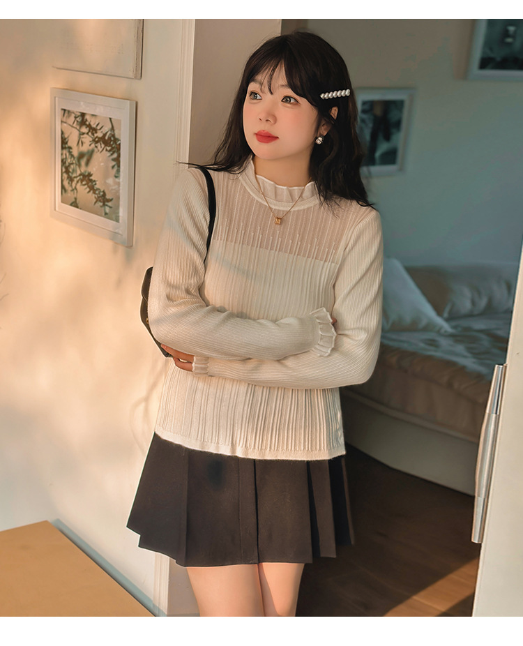 フリルが施された首元&袖先は、立体感と動きのある印象を与えます。シアーなデコルテ部分は、程よいセクシーさを演出し、女性らしい魅力を引き立てます。袖には透け感がないので秋冬の肌寒い季節にも着用しやすいデザインです。