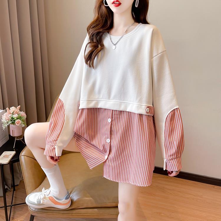 トレーナーとストライプシャツが一体化したこのトップスは、スタイリッシュさと快適さを兼ね備えた画期的なデザインです。トレーナーのカジュアルさとシャツの上品さを融合させた、まさにワンランク上のアイテムとなっています。